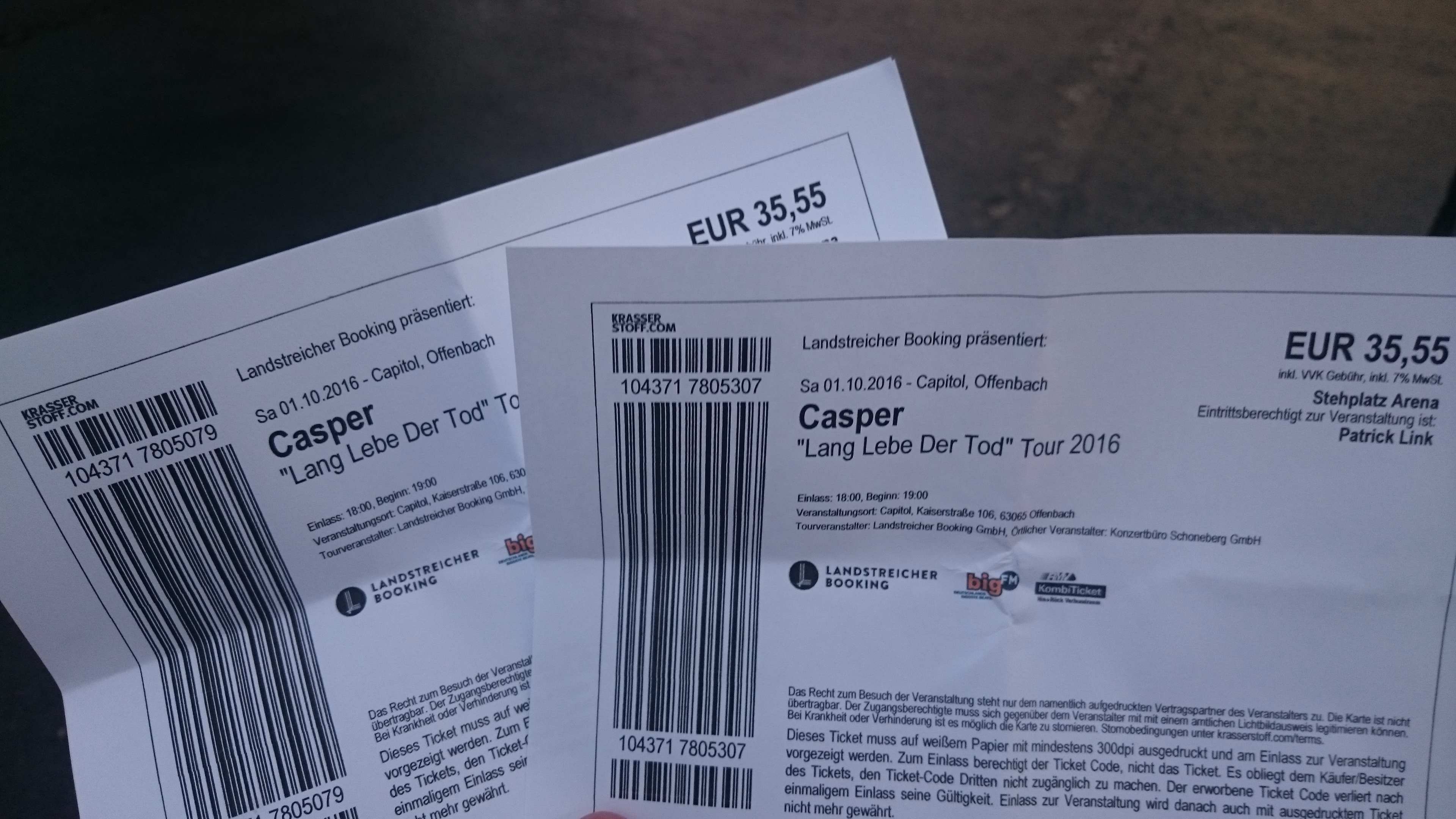 Eine positive Überraschung an diesem Tag war ein kleiner Brief, den ich morgens auf dem Wohnzimmertisch fand. 2 Karten für das Casperkonzert am nächsten Tag in Offenbach, damit Du endlich Dein Date mit Casper haben kannst.