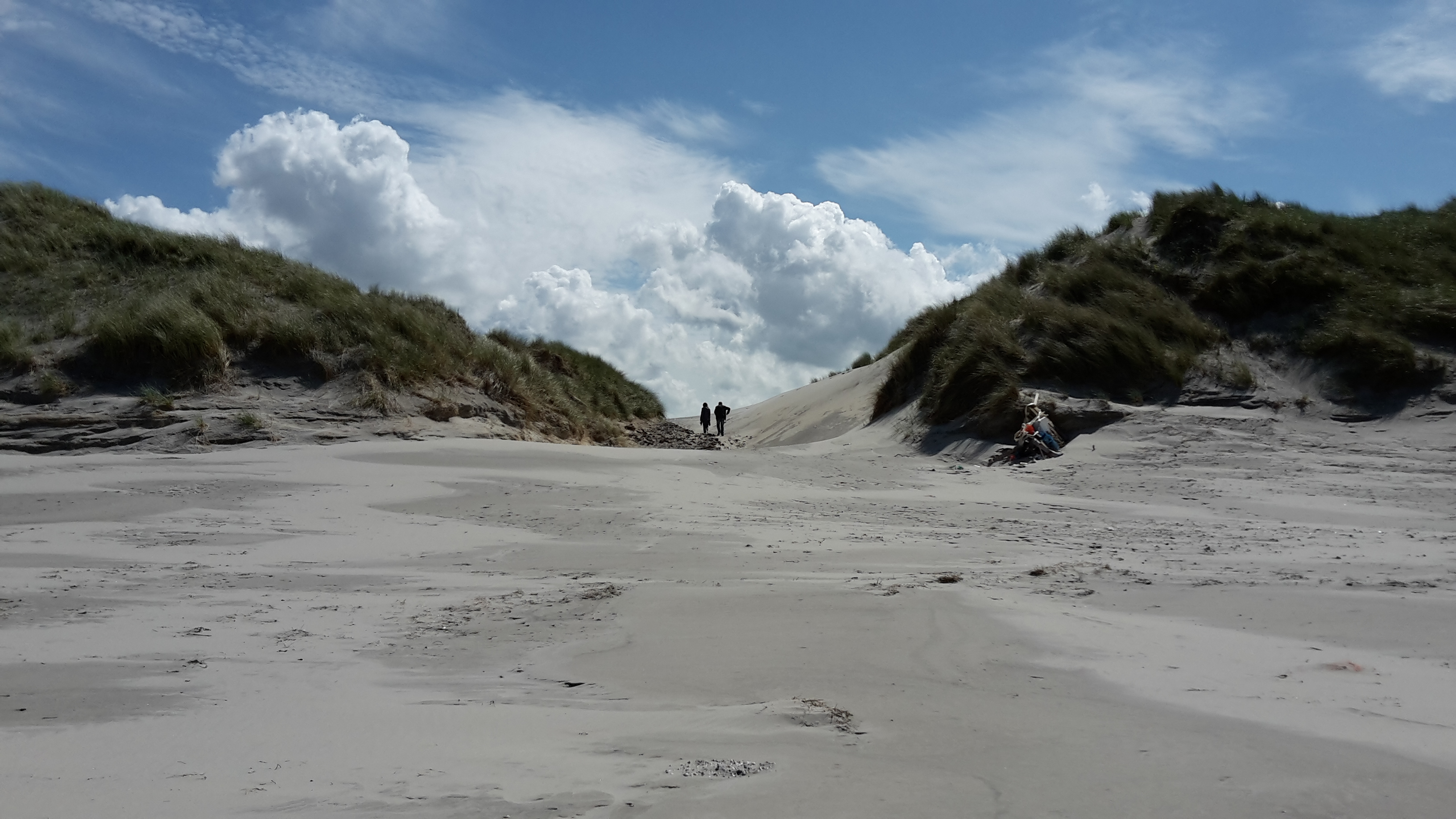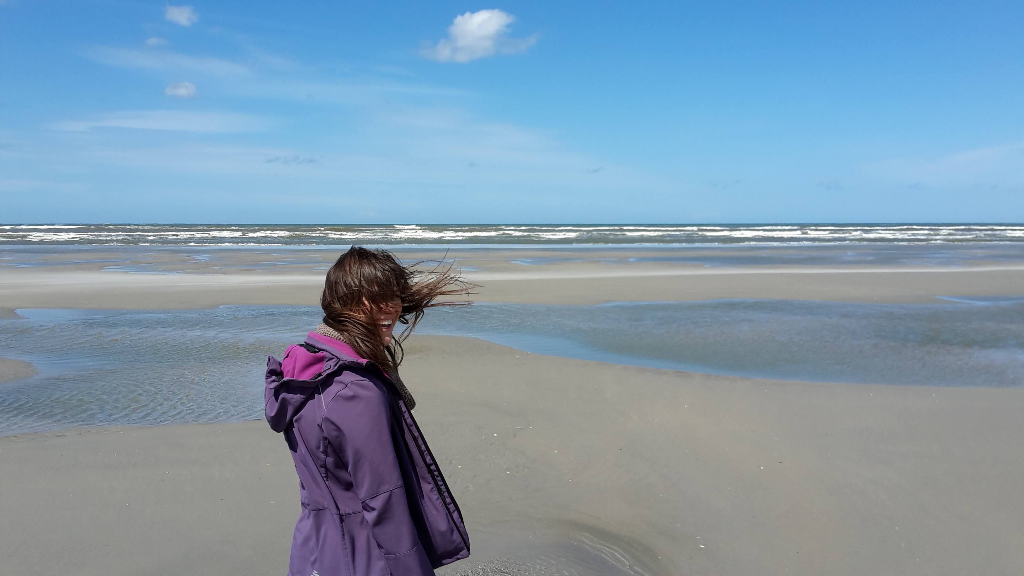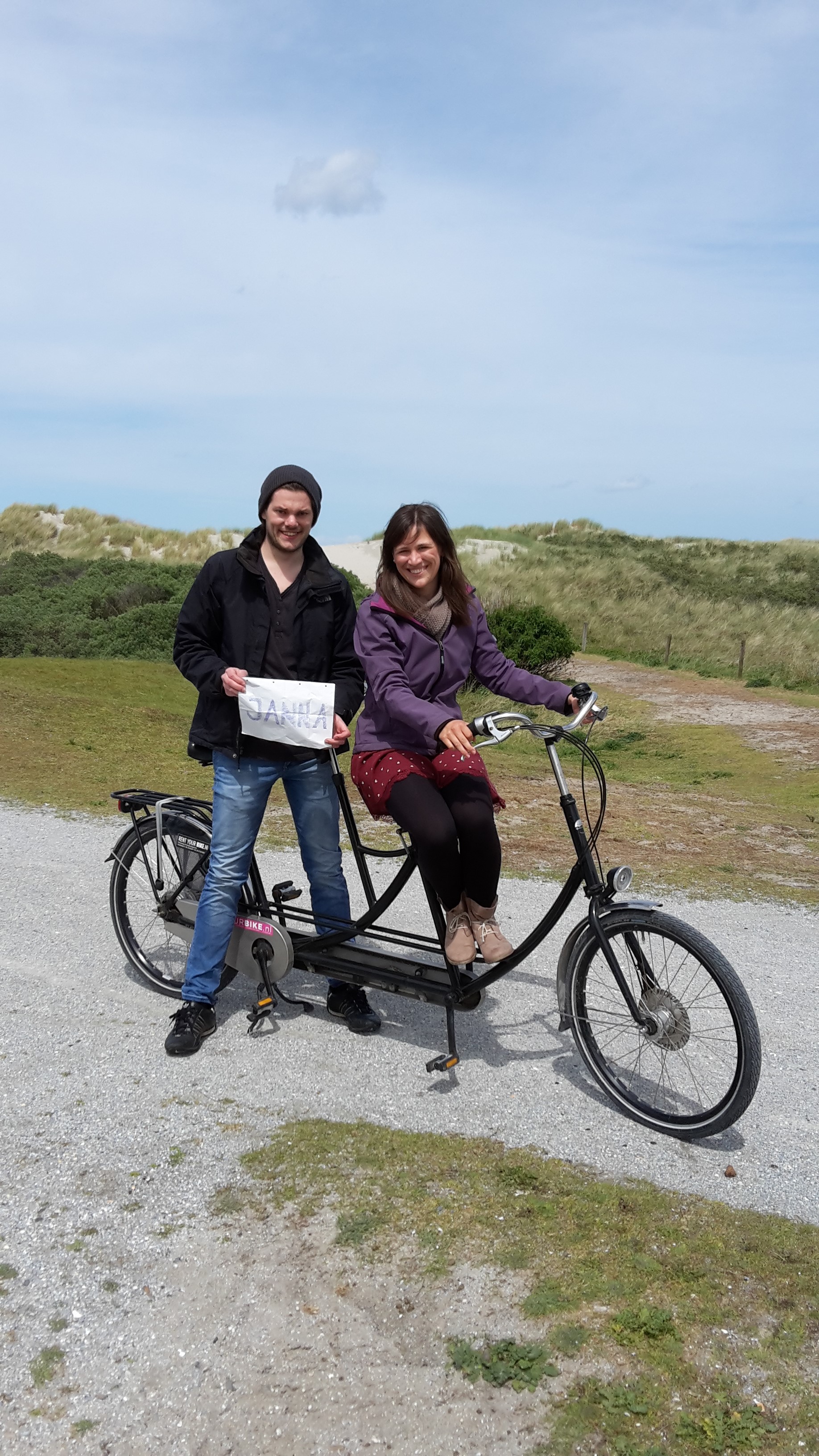 Kurzes Satteleinstellen und ab ging die Sause. Zunächst eher strauchelnd als souverän fuhren wir den mit Muscheln befestigten Weg direkt Richtung Strand. Unser Ziel war ein Aussichtspunkt am östlichen Zipfel der Insel. Um dort hinzugelangen, passierten wir das äußerst hügelige Naturschutzgebiet Het Oerd, das vielen Vogelarten als Brutstätte dient. Janna – Tandem fahren ist gar nicht so leicht – vor allem wenn man unterschiedlich schnell fahren möchte! =D Nach einer Weile hatten wir den Dreh dann aber raus. Ganz in Janna-Schlitzohr-Manier – einfach den anderen treten lassen – der merkt schon nix. =D Wir konnten dein schelmisches Grinsen förmlich spüren. =D Erschwerend kam noch dazu, dass wir bei unserer Probefahrt mit maximal 3 km/h und Buschlandung nicht bemerkt hatten, dass die Bremsen unseres Tandems nicht, oder wenn doch nur mit einem unerträglichen Quietschen, funktionierten. Bremsen ging also nicht, was Tobis Spaß und Kimberleys Angst ins Unermessliche steigerte. Außerdem wollten wir natürlich nicht für den Rückgang der örtlichen Möwenpopulation, aufgrund von Möwentrommelfellruptur, verantwortlich sein.