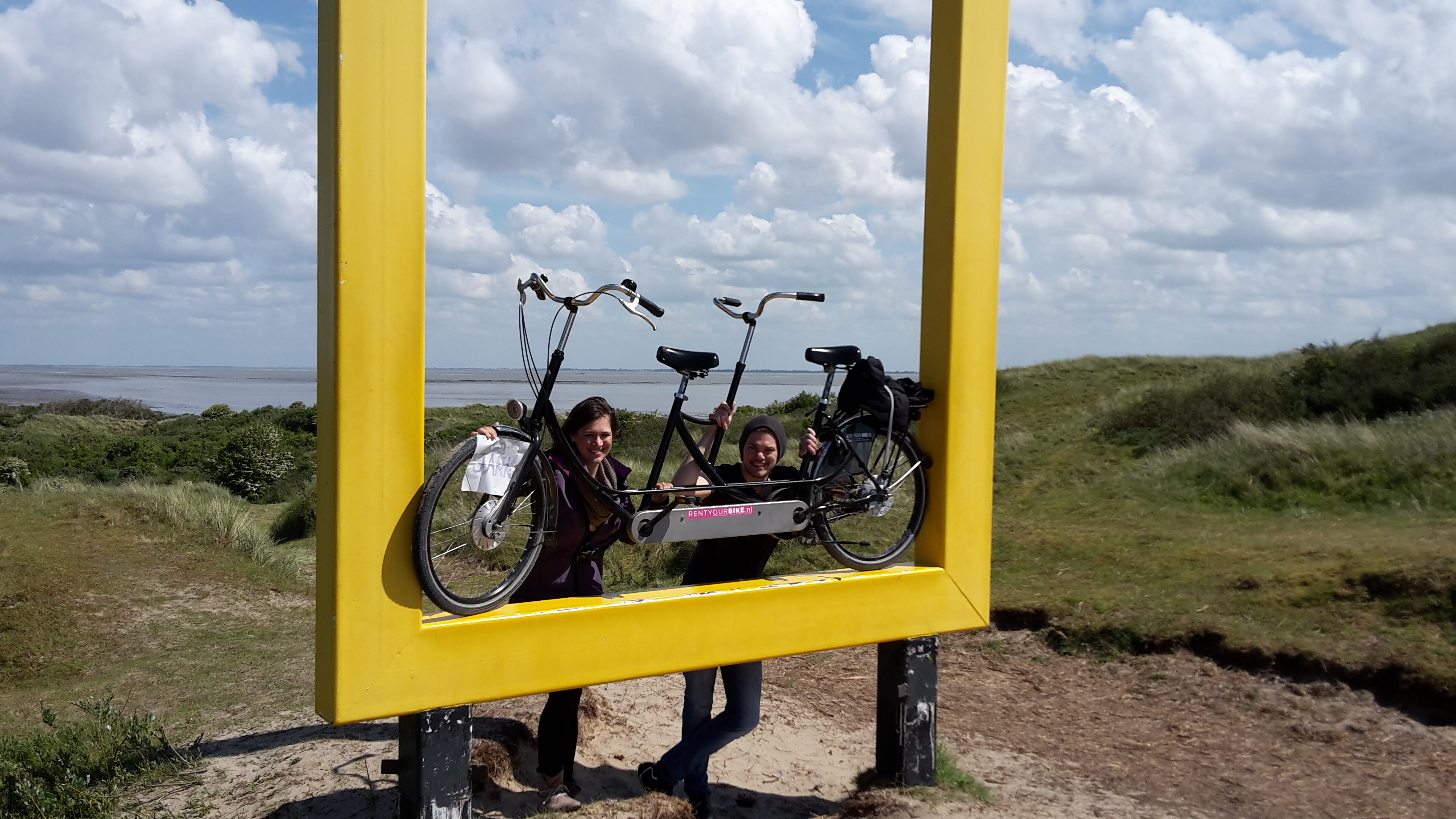 Die Strecke war wirklich sehr schön. Umzingelt von Sanddünen und glücklichen Möwen machten wir immer wieder halt, um über schmale Trampelpfade Richtung Meer zu laufen. Obwohl es recht frisch war, steckten wir wenigstens den großen Zeh in die Nordsee. Als wir am Aussichtspunkt ankamen, lachte uns ein riesiger gelber Rahmen an. Es war sofort klar, dass wir uns samt Tandem darin ablichten mussten.