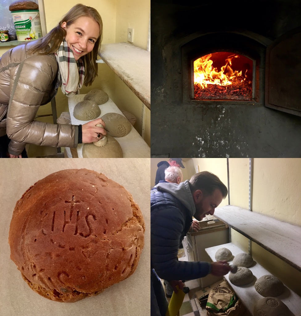 Im Hotel angekommen, gingen wir auch direkt schlafen, denn der Wecker klingelte am nächsten Tag – wohl gemerkt ein Samstag! – um 6 Uhr… Egal! Ich war einfach nur voller Vorfreude! Um 7 trafen wir bei der Schwester eines sehr guten Freundes von Tobi ein, die mit uns zusammen zum Bauernhof fuhr. Dort angekommen, wurden wir super lieb begrüßt und gleich in die Stube hereingeführt, in der gerade Brot gebacken wurde. Wenn wir wollten, dürften wir hierbei zuschauen und/oder auch gerne helfen. Aber na klar! Ärmel hoch gekrempelt und los ging’s 🙂 Wir durften die Brote mit dem hauseigenen Stempel stempeln (leider haben wir schon wieder vergessen, wofür genau die Buchstaben noch mal stehen 😀 ). Die Brote wurden noch in einem echten Feuerofen gebacken. Ich fand es super interessant, wie man testet, ob der Ofen die passende Temperatur hatte – das wusste ich tatsächlich noch nicht! Man wirft ein bisschen Mehl hinein und dann … Öhm… Vergessen! Auf jeden Fall sieht man je nach Verhalten des Mehls, ob die richtige Temperatur erreicht ist 😀
