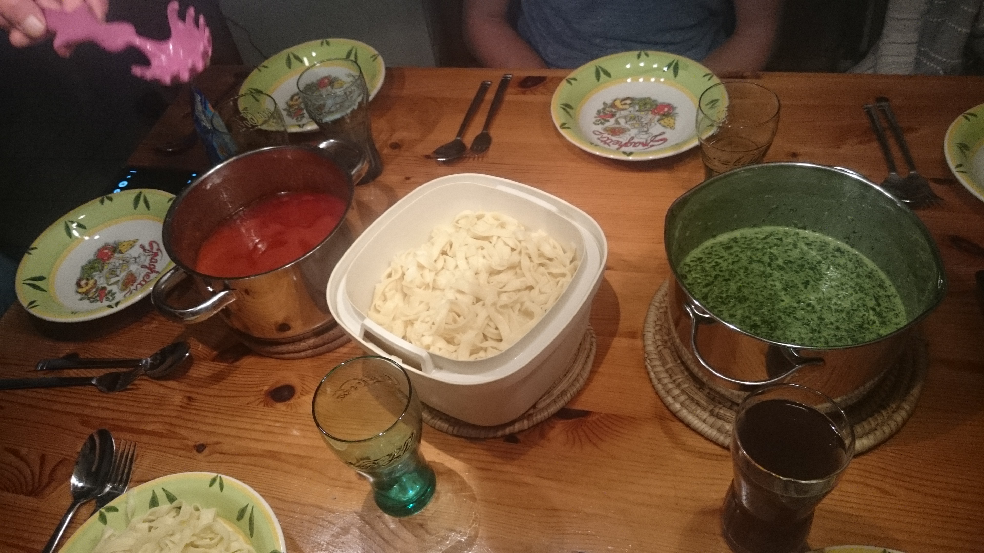Als die Nudeln dann nach 2-3 Minuten (!) fertig waren, durften wir das Festmahl genießen. Da die männlichen Mägen in dieser Runde nicht ohne Fleisch zufriedengestellt werden konnten, haben wir zusätzlich zur Bolognese noch ganz Jannatypisch Deine geliebe Spinatsoße kreiert! Naja okay, Suse hat sie kreiert… 😛