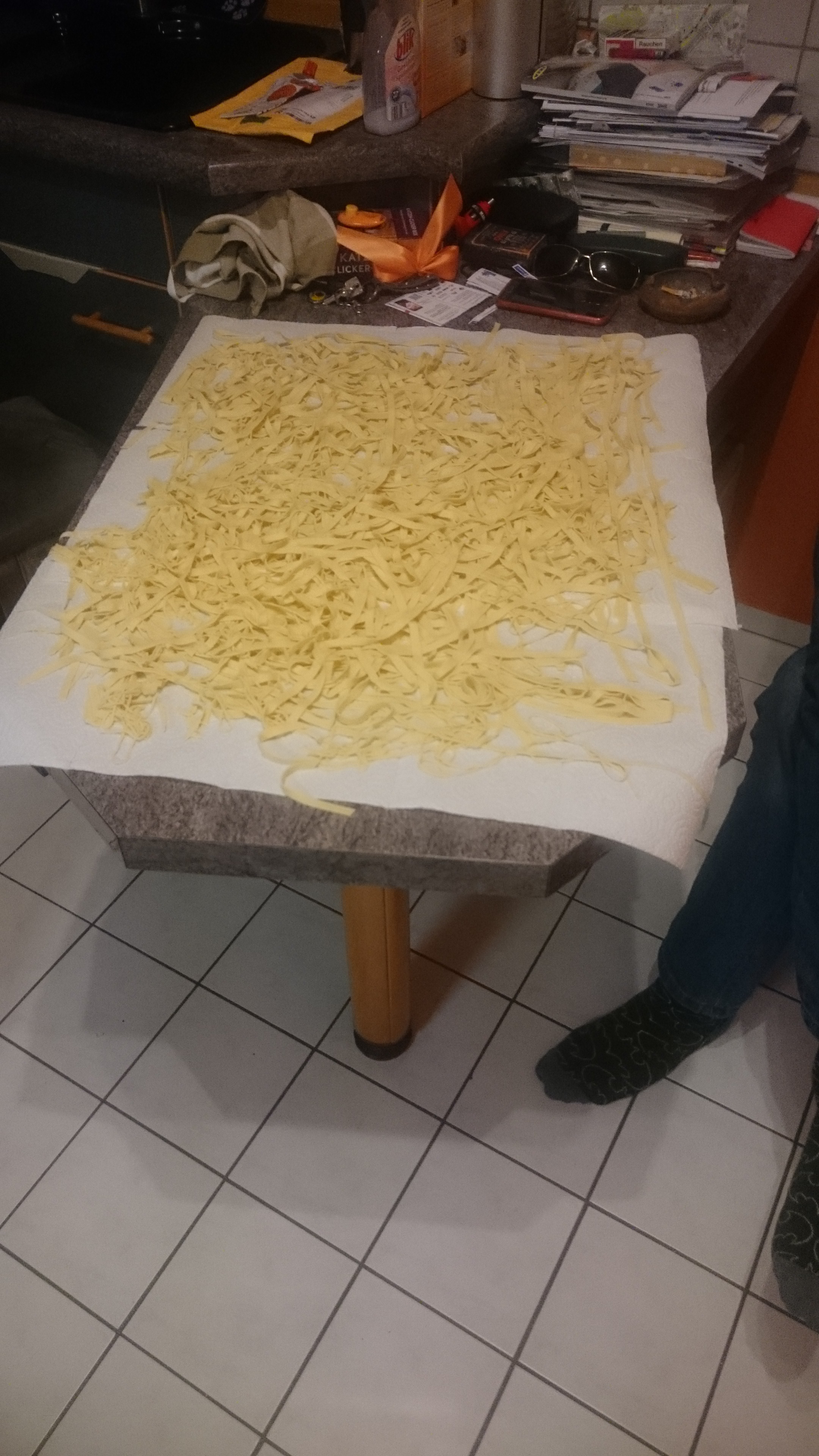 Diesen Nudelteig trocken zu bekommen, ihn durch diese Nudelmaschine zu zwängen und ihn immer dünner werden zu lassen ohne, dass er reißt und anschließend auch noch in schöne lange Nudeln schneiden zu lassen, ist eine wahre Kunst. Ach was rede ich, es ist eine Lebensaufgabe! Wir haben circa um 18:50 Uhr angefangen damit….um 22:30 Uhr haben wir dann gegessen. Nie im Leben hättest Du so lange auf Dein Essen gewartet ohne zu murren! Naja okay…. das haben wir ja auch 😛